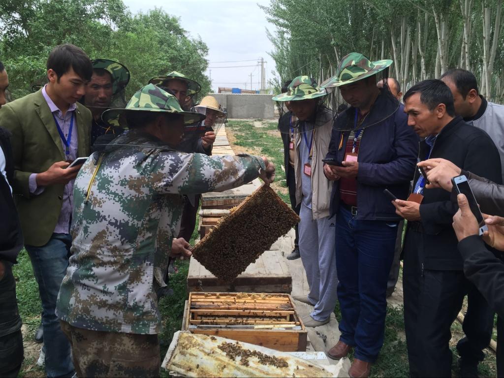莎车县农经局麦麦提尼亚孜全程陪同参观,全体学员分别观摩了莎车县乐义养蜂农民专业合作社、 莎车县米夏乡夏玛力巴格大樱桃农民专业合作社、莎车县古再村手工农民专业合作社、莎车县夏普其畜禽养殖农民专业合作社共四家特色鲜明代表性很强的合作社。各个合作社的的社长分别从合作社的成立、发展、经营及企业产品等几个方面对学员们进行讲解。在观摩过程中,社长们现场精彩的解说使大家深受启发,不时有学员向社长询问自己合作社在经营过程遇到的问题和困惑,特别是莎车县乐义养蜂农民专业合作社张乐义社长热情、细心给大家讲解、和学员交流,鼓励学员在合作社的发展中一定要坚持,让学员对今后合作社发展更有信心,也积累了宝贵经验。来自疏附县艾丽苏亚尔农民专业合作社的艾麦提江·吐尔荪当场向张社长订购了50箱蜜蜂,自己有30亩的红枣园,回去之后可以进行养蜂,表示要派专人来学习养蜂技术和先进的制作技术。