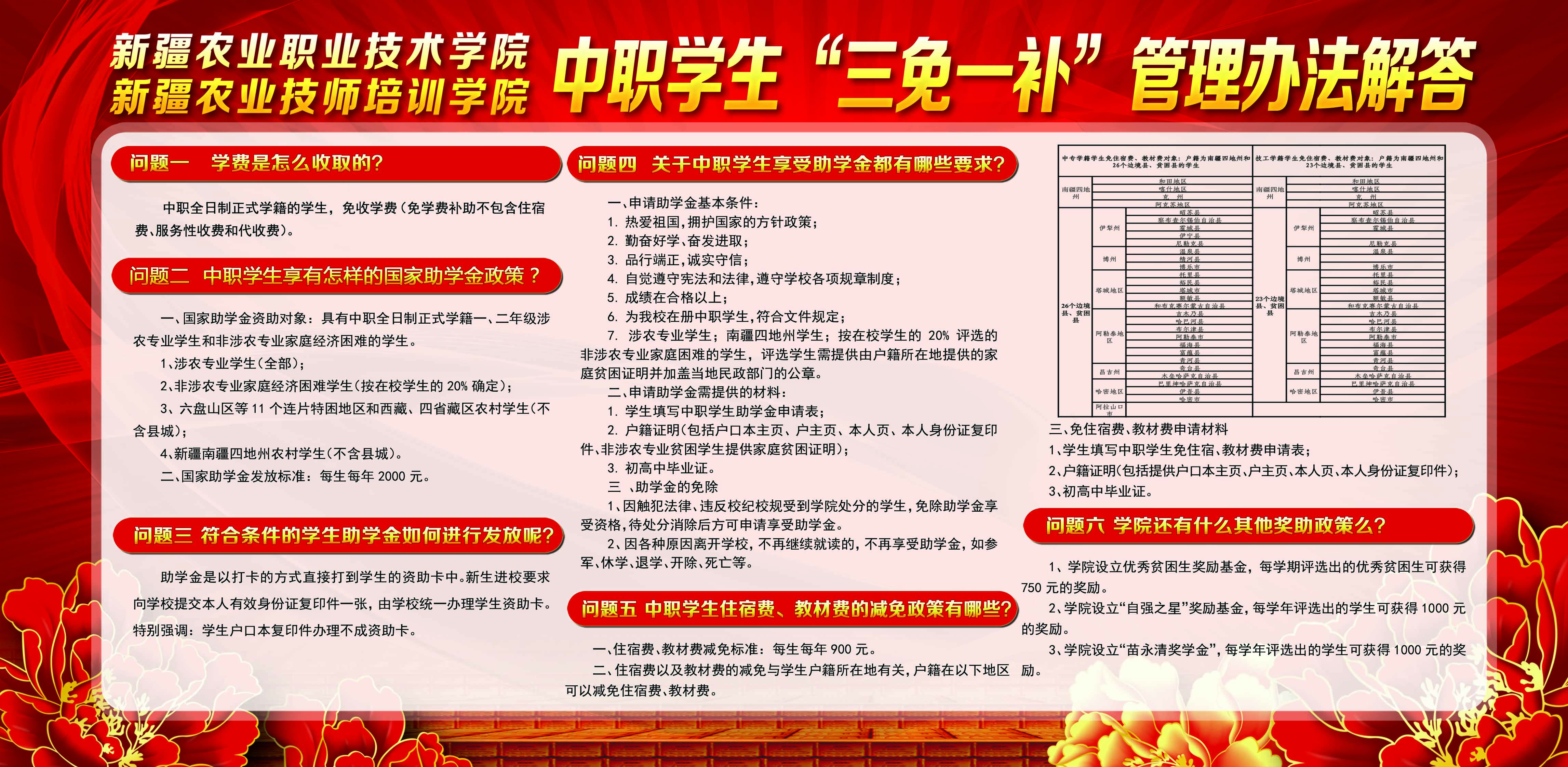 南疆四地州,23个边境县学生不分专业和户籍性质享受每学期住宿费300元和教材费150元的减免政策,连续享受三年。